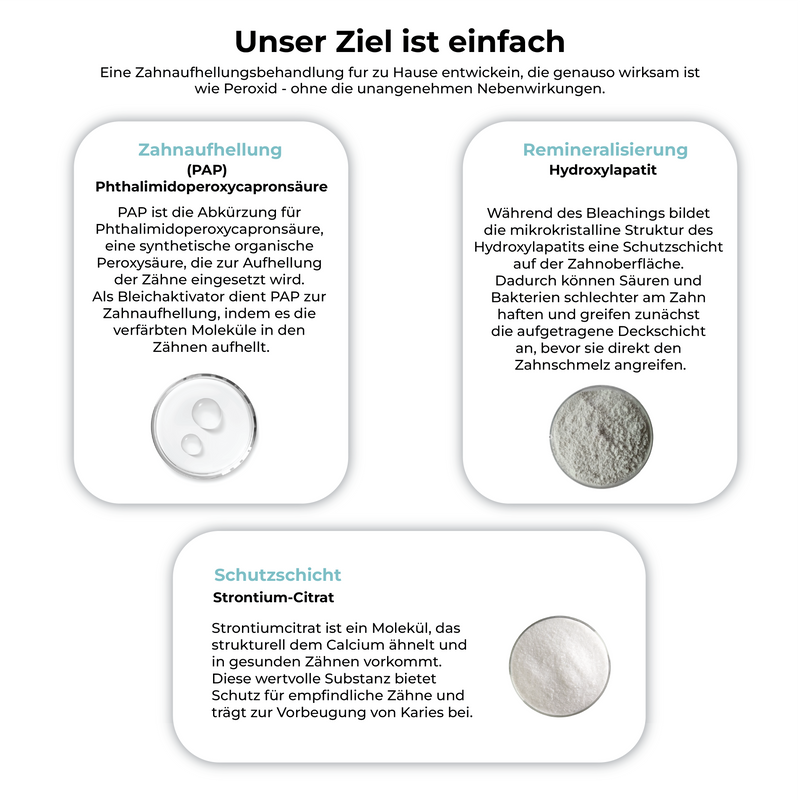 Unsere neu entwickelte PAP-Formel ist nun noch effektiver. Strahlend weiße Zähne, jetzt bis zu 5x effektiver als handelsübliche Bleaching Produkte.